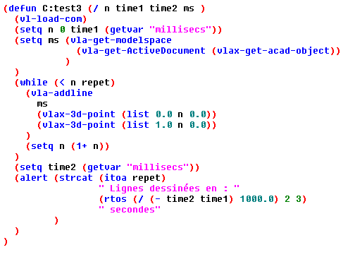 1 2 3 4 5 6 7 8 9 10 11 12 13 14 15 16 17 18 19 20 21 22 23 24 25 26 27 28 29 30 31 32 33 34 35 36 37 38 39 40 41 42 43 44 45 46 47 48 49 50 51 52 53 54 55 56 57 58 59 60 61 62 63 64 65 66 67 68 69 70 71 72 73 74 75 76 | (setq repet 2000);nombre de répétitions (setvar "osmode" 0);aucun accrochage objets ;================================= (defun C:test1 (/ n time1 time2 ) (setvar "cmdecho" 1) (setq n 0 time1 (getvar "millisecs")) (while (< n repet) (command "._line" (list 0.0 n 0.0) (list 1.0 n 0.0) "") (setq n (1+ n)) ) (setq time2 (getvar "millisecs")) (alert (strcat (itoa repet) " Lignes dessinées en : " (rtos (/ (- time2 time1) 1000.0) 2 3) " secondes") ) ) ;================================= (defun C:test2 (/ n time1 time2 ) (setvar "cmdecho" 0) (setvar "nomutt" 1) (setq n 0 time1 (getvar "millisecs")) (while (< n repet) (command "._line" (list 0.0 n 0.0) (list 1.0 n 0.0) "") (setq n (1+ n)) ) (setq time2 (getvar "millisecs")) (alert (strcat (itoa repet) " Lignes dessinées en : " (rtos (/ (- time2 time1) 1000.0) 2 3) " secondes") ) (setvar "cmdecho" 1) (setvar "nomutt" 0) ) ;================================= (defun C:test3 (/ n time1 time2 ms ) (vl-load-com) (setq n 0 time1 (getvar "millisecs")) (setq ms (vla-get-modelspace (vla-get-ActiveDocument (vlax-get-acad-object))) ) (while (< n rept) (vla-addline ms (vlax-3d-point (list 0.0 n 0.0)) (vlax-3d-point (list 1.0 n 0.0)) ) (setq n (1+ n)) ) (setq time2 (getvar "millisecs")) (alert (strcat (itoa repet) " Lignes dessinées en : " (rtos (/ (- time2 time1) 1000.0) 2 3) " secondes") ) ) ;================================= (defun C:test4 (/ n time1 time2 ) (setq n 0 time1 (getvar "millisecs")) (while (< n repet) (entmake (list (cons 0 "LINE") (cons 10 (list 0.0 n 0.0)) (cons 11 (list 1.0 n 0.0)) ) ) (setq n (1+ n)) ) (setq time2 (getvar "millisecs")) (alert (strcat (itoa repet) " Lignes dessinées en : " (rtos (/ (- time2 time1) 1000.0) 2 3) " secondes") ) ) |