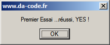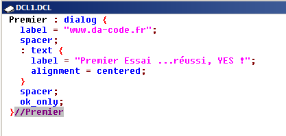 1 2 3 4 5 6 7 8 9 10 | Premier : dialog { label = "www.da-code.fr"; spacer; : text { label = "Premier Essai ...réussi, YES !"; alignment = centered; } spacer; ok_only; }//Premier |