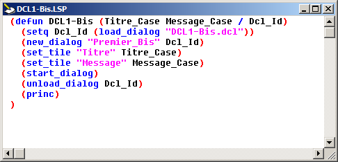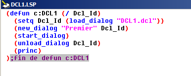 1 2 3 4 5 6 7 | (defun c:DCL1 (/ Dcl_Id) (setq Dcl_Id (load_dialog "DCL1.dcl")) (new_dialog "Premier" Dcl_Id) (start_dialog) (unload_dialog Dcl_Id) (princ) );fin de defun c:DCL1 |