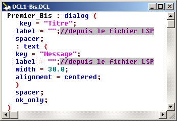 1 2 3 4 5 6 7 8 9 10 11 12 13 | Premier_Bis : dialog { key = "Titre"; label = "";//depuis le fichier LSP spacer; : text { key = "Message"; label = "";//depuis le fichier LSP width = 30.0; alignment = centered; } spacer; ok_only; } |
