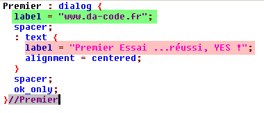 1 2 3 4 5 6 7 8 9 10 | Premier : dialog { label = "www.da-code.fr"; spacer; : text { label = "Premier Essai ...réussi, YES !"; alignment = centered; } spacer; ok_only; }//Premier |