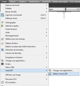 Pour les adeptes de la souris et des menus aller dans Outils, puis AutoLISP puis Editeur Visual LISP