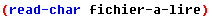 | argument | descripteur-fichier, optionnel, le descripteur d'un fichier ouvert, obtenu par la fonction (open)si descripteur-fichier n'est pas renseigné, chaque appel de (read-char) renvoie le contenu de la ligne de commande caractère par caractère jusqu'au code 10 (fin de fichier) |